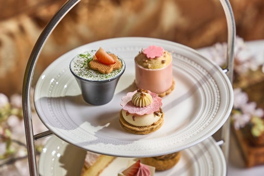 バンケットシェフ片山泰宏によるセイヴォリーでは、グリーンビーンズの鮮やかなグリーンが春らしい息吹を感じさせる「スモークダックブレスト タラゴンマスタードとグリーンビーンズのサラダ」や、愛らしいピンク色の桜風味のクリームチーズに、ナッツとドライフルーツを添えた見た目も華やかな一品など、春らしいエッセンスが随所に散りばめられた品々をご用意いたしました。