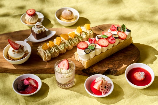 今回のスイーツはエグゼクティブペストリーシェフ フレデリック・モローが手掛ける3種のフランス伝統菓子パリ・ブレスト、ミルフィーユ、バスクケーキなど、いちごや桜をはじめとする春の香りをふんだんに纏わせたラインナップです。フレデリック一押しのパリ・ブレストは、彼が製菓学校に通い始めたころ、両親のために作った最初のケーキで、数あるスイーツの中でも今なお両親に最も愛されている一品です。さくさく軽やかなシュー生地に風味豊かなキャラメライズヘーゼルナッツクリームをたっぷりと挟み、当時のオリジナルレシピを今も変わらず守り続けているこだわりの詰まった逸品です。そのほか、フランス伝統菓子ミルフィーユには、キャラメルと玄米茶のジャムを忍ばせた香ばしい風味が広がるカスタードクリームを重ねました。また、桜を模したチョコレートが華やかに飾られ、見た目にも春らしさが漂うスイーツ「ホワイトチョコレートと抹茶ガナッシュ ストロベリーホイップクリーム」。その中は、ピンクの可憐な装いからは想像もつかない、ほろ苦い抹茶の生チョコレートで、味わいにさりげない遊び心を添えています。
