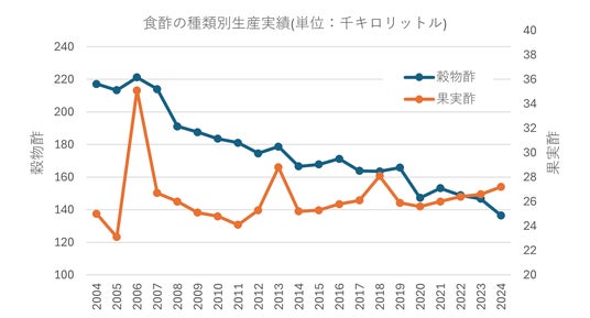 近年の健康志向の高まりから、調味料だけでなく飲用酢としても使用できる果実酢の市場は拡大傾向にある一方、穀物酢の市場は減少傾向にあります(図1)。簡便化志向の高まりから、家庭でお酢を調味料として使用する機会や仕込みに時間をかける料理をする機会が減ってしまったことが要因であると考えられます。