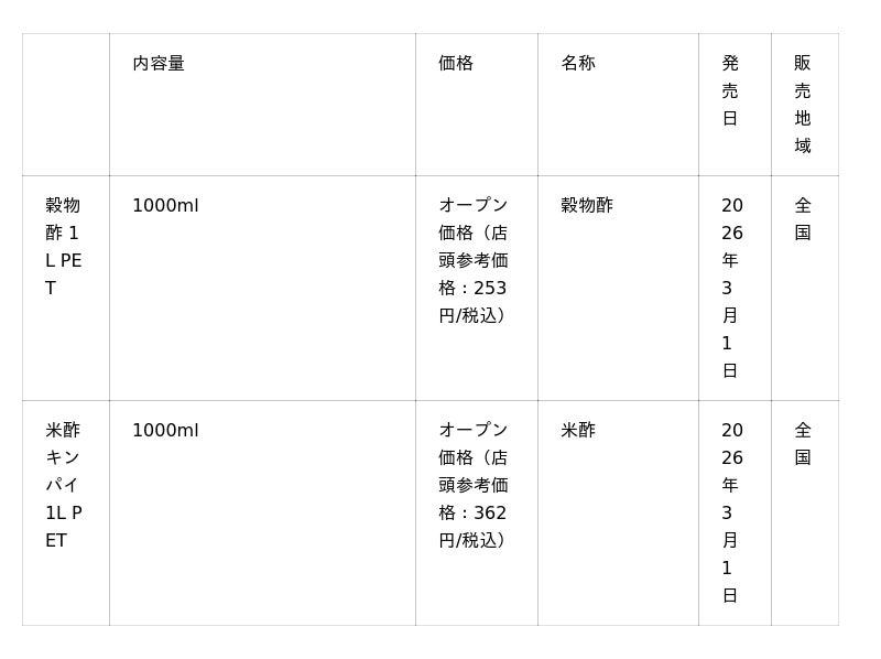 1590年頃、豊臣時代から伝統と革新を紡ぐ醸造酢メーカー、タマノイ酢(株)(本社:大阪府堺市 代表取締役社長:播野貴也、以下当社)は、「穀物酢 1L PET」と「米酢キンパイ 1L PET」を2026年3月1日(日)よりリニューアル発売いたします。今回は900mL瓶から大容量1L PETタイプに容器形態を変更いたしました。物価高騰対策の手助けとなるよう、国産100%の米を使った風味豊かな味とお得な価格はそのままに、高品質かつ大容量を実現いたしました。