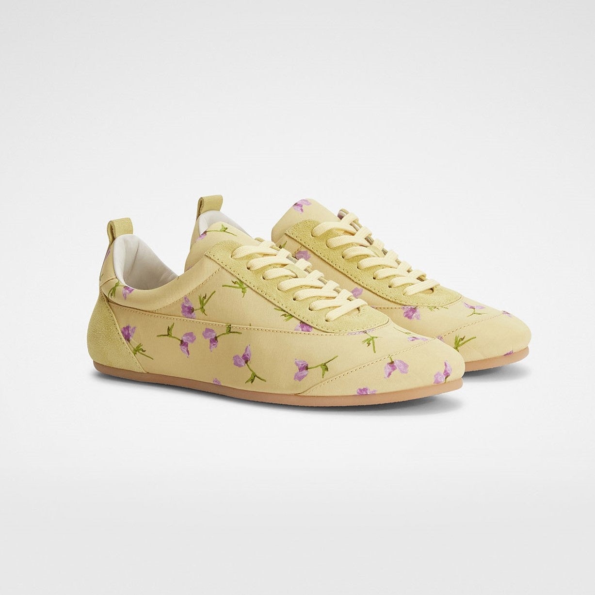 バレエシューズから着想を得たフラットなスニーカー“ETAGE”。温かみのあるスエード素材と、つやのあるフェミニンなサテン生地を組み合わせてクリーンに仕上げたSS26の新作。