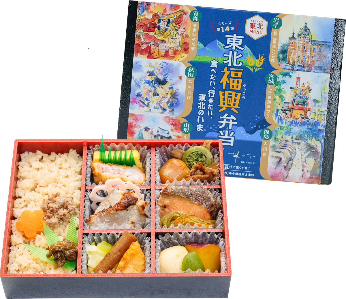 東北福興弁当は、東日本大震災からの復興に続き、更なる発展を目指す“福興(ふっこう)”を祈念した幕の内弁当です。中小機構の復興支援事業等を活用した事業者および国の認定(地域産業資源活用事業計画および農商工等連携事業計画)を受けた事業者が提供する東北各地の自慢の食材により作られています。
