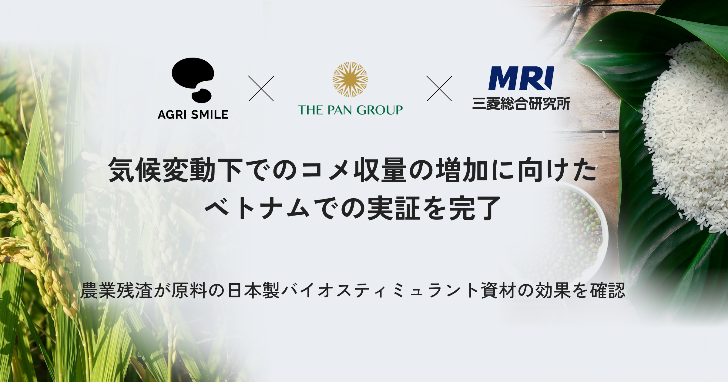 株式会社AGRI SMILE(本社:東京都千代田区、代表取締役CEO:中道 貴也、以下 AGRI SMILE)および株式会社三菱総合研究所(本社:東京都千代田区、代表取締役社長執行役員:籔田 健二、以下 三菱総合研究所)は、THE PAN GROUP JOINT STOCK COMPANY(Head office:Tay Ninh Province, Vietnam、CEO:Nguyen Thi Tra My、以下 PAN)と連携し、2025年6月から5カ月にわたり、ベトナム・フンイエン省で「バイオスティミュラント資材を活用したベトナムにおけるコメ生産の気候変動対策・肥料吸収効率化の実証」を実施しました。AGRI SMILEが開発したバイオスティミュラント資材を散布した結果、コメの収量が43%増加する効果を確認しました。