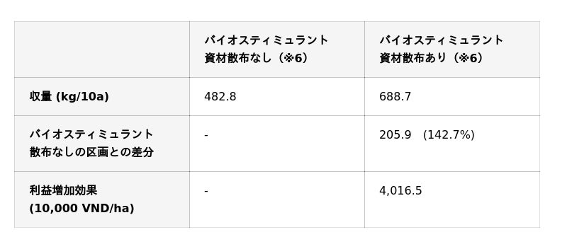 バイオスティミュラント資材の散布有無による対照実験を行った結果、バイオスティミュラント資材を散布した圃場ではイネの高温耐性および根張りが向上し、コメの収量は1.43倍増加しました。これは1haあたりに換算すると、4,020万VND(ベトナム・ドン、日本円では約24万円(※4))の利益増加に相当し、費用対効果比率は6.1倍となります(※5)。