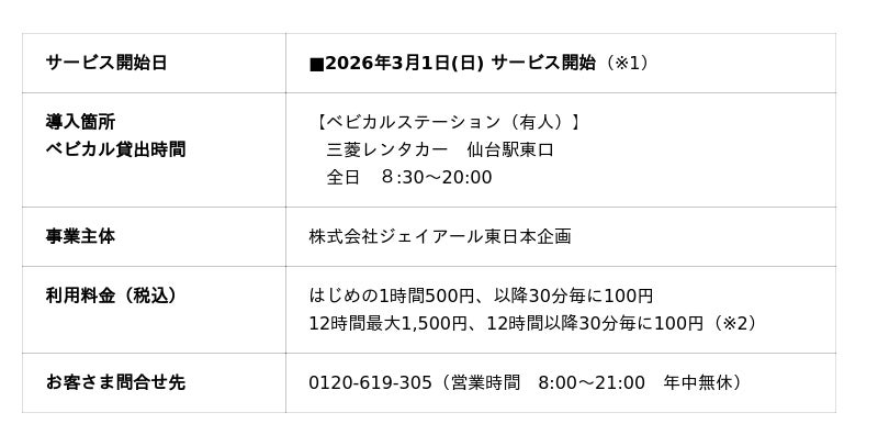 ○この度、三菱自動車ファイナンス株式会社と連携し、「三菱レンタカー 仙台駅東口」で3月1日よりサービスを開始します。三菱レンタカーでは、ベビーカーや大きなお荷物をお持ちの方でも安心してご利用いただけるよう、用途に合わせた車種をご用意しております。ご家族との大切なひとときを、より快適にお過ごしいただけるよう、心を込めてサポートいたします。