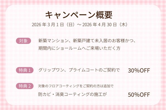 今回のキャンペーンでは、新生活を迎えるご家庭を応援するため、通常価格より大幅なプライスダウンを実現いたしました。高品質の施工と手厚い保証を、今だけの特別な価格でご活用いただけます。