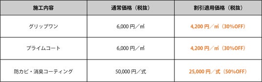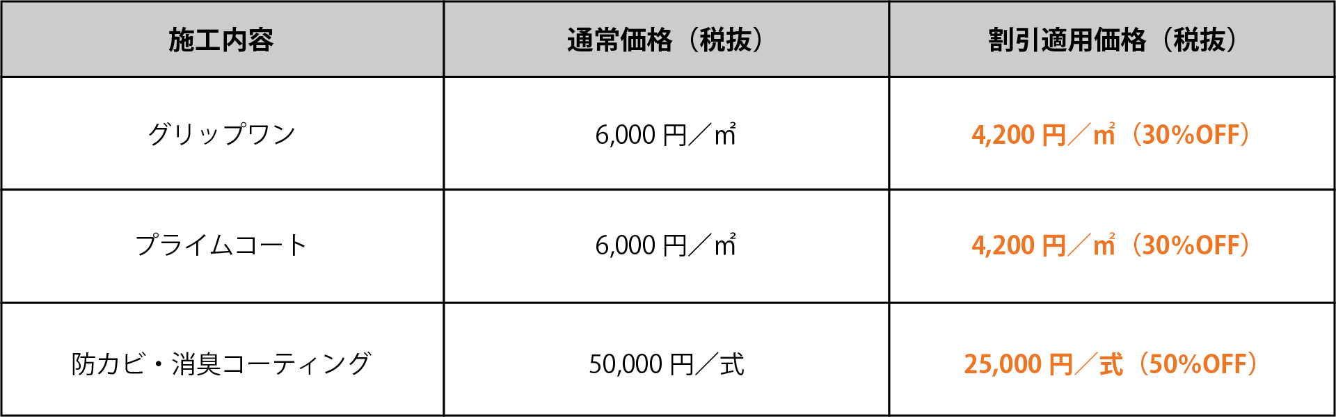 - 対象商品は「グリップワン」、「プライムコート」および「防カビ・消臭コーティング」に限ります。
