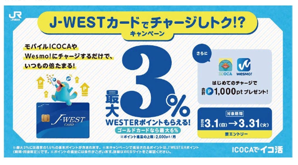 モバイルICOCAにJ-WESTカードを紐づけている方は最大2,000ポイント