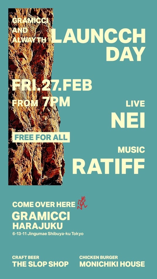 発売前日の2月27日(金)19時より、Gramicci Harajuku 3F「G GALLERY」にて、Gramicci & ALWAYTH Vol.2 ローンチパーティを開催いたします。発売に先駆けて、先行販売を実施いたします。本パーティでは昨年11月にニューシングル『upright』をリリースして話題となったラッパー・NEIによるライブパフォーマンスに加え、ビートメイカー/DJ/ラッパーとしても活動するratiff(ラティフ)によるDJプレイを実施。さらに、「YENTOWN(イエンタウン)」のメンバー「MonyHorse(モニーホース)」がプロデュースを手掛けるチキンバーガー専門店・MONICHIKIHOUSE(モニチキハウス)によるケータリングの提供に加えて、東京・目黒区にあるクラフトビールに特化したセレクトショップ・The Slop Shopのクラフトビールを提供いたします。東京の音楽とフードカルチャーとGramicciが交差する一夜限りのイベントとなります。