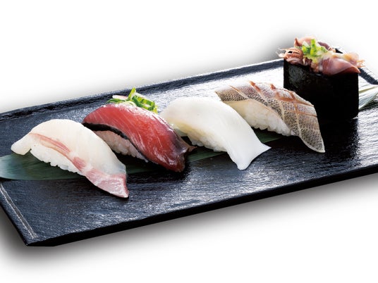 季節ごとに内容を変えて登場する人気の五貫盛り!真鯛・藁焼きかつお・いか・赤かます塩〆炙り・釜揚げほたるいかが1貫ずつ楽しめるので、最後まで飽きずにお召し上がりいただけます。