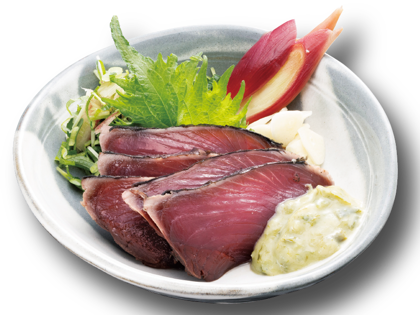 脂が程よくのった新鮮なかつおを、強火で丁寧に藁焼きで仕上げました。お好みで香味野菜とを添えてお召し上がりください。