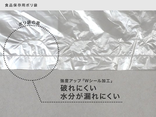 Wシール加工のため強度がアップし、袋の底が破れにくいです。水気のあるものや調理時に揉み込んでも安心です。