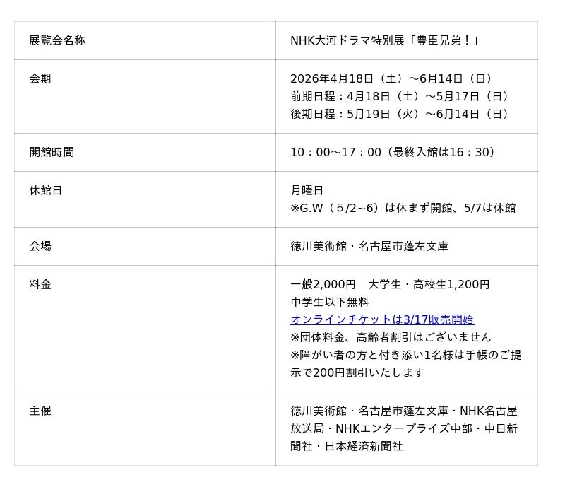 2026年の大河ドラマ「豊臣兄弟!」は、「彼が長生きしていれば豊臣家の天下は安泰だった」とまで言わしめた豊臣秀長の目線で、戦国時代をダイナミックに描く物語です。本展覧会ではドラマと連動し、これまであまり光の当たることがなかった秀長の人となり、兄・秀吉の天下一統を支えた数々の功績を貴重な歴史資料から読み解いていきます。兄弟が仕えた織田信長、臣従させた大大名・徳川家康、家臣として重用した黒田官兵衛、藤堂高虎など名だたる武将たち、文化面のブレーンとなった千利休、豊臣家の最期を見届けた家族の高台院らゆかりの品々が揃います。