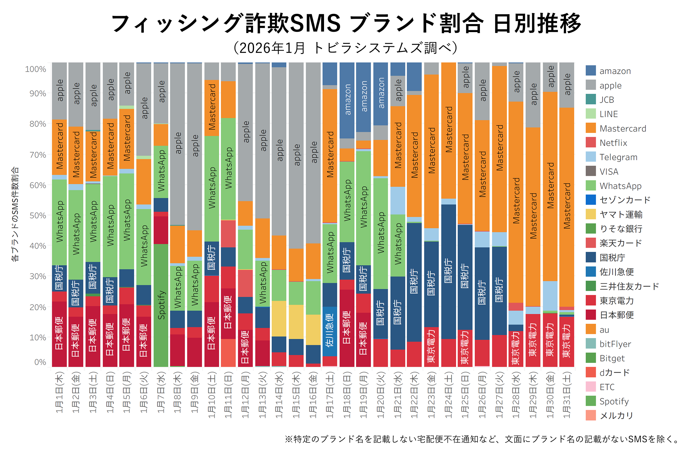 実在する企業やブランドをかたるSMSについて、2026年1月は「Apple」をかたるSMSが17日以降一時減少しましたが、25日ごろから再び活発化しました。