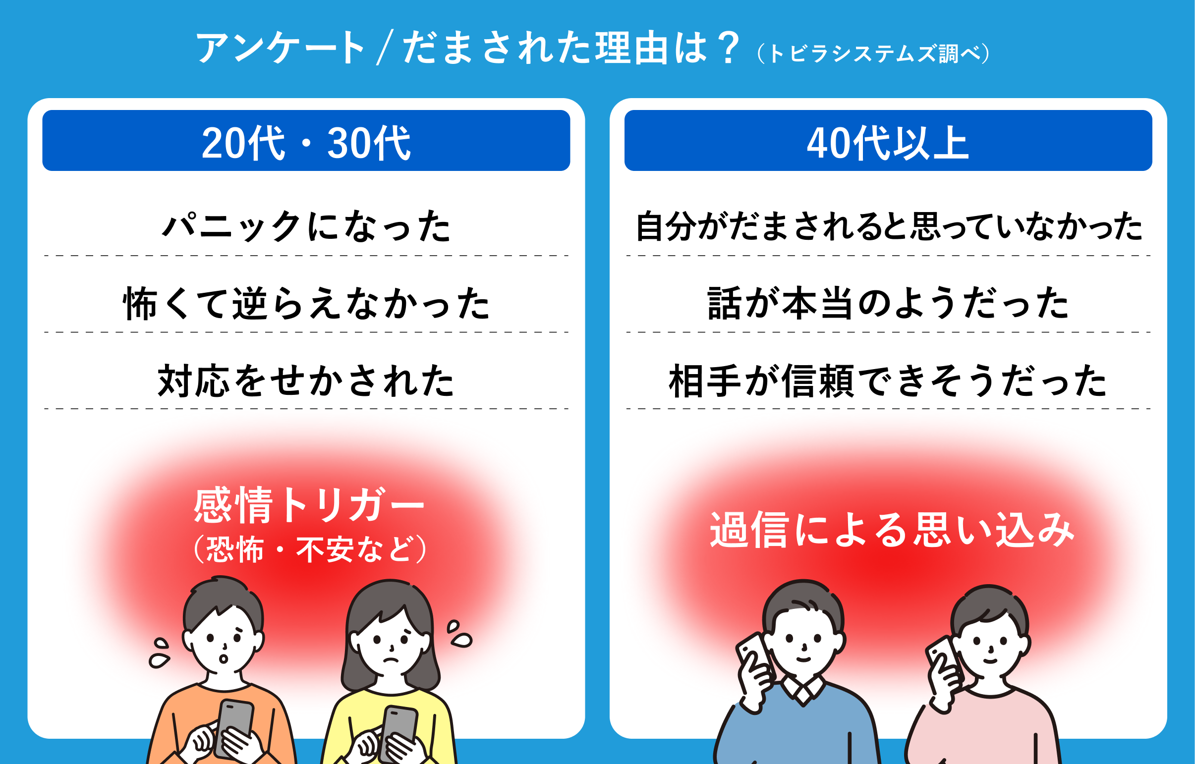 また、トビラシステムズが以前実施したアンケート調査で、若者は「恐怖」「パニック」など感情的な要因によりだまされる傾向にあることが示されました。警察官という“権威性”に揺さぶられやすい恐れがあります。