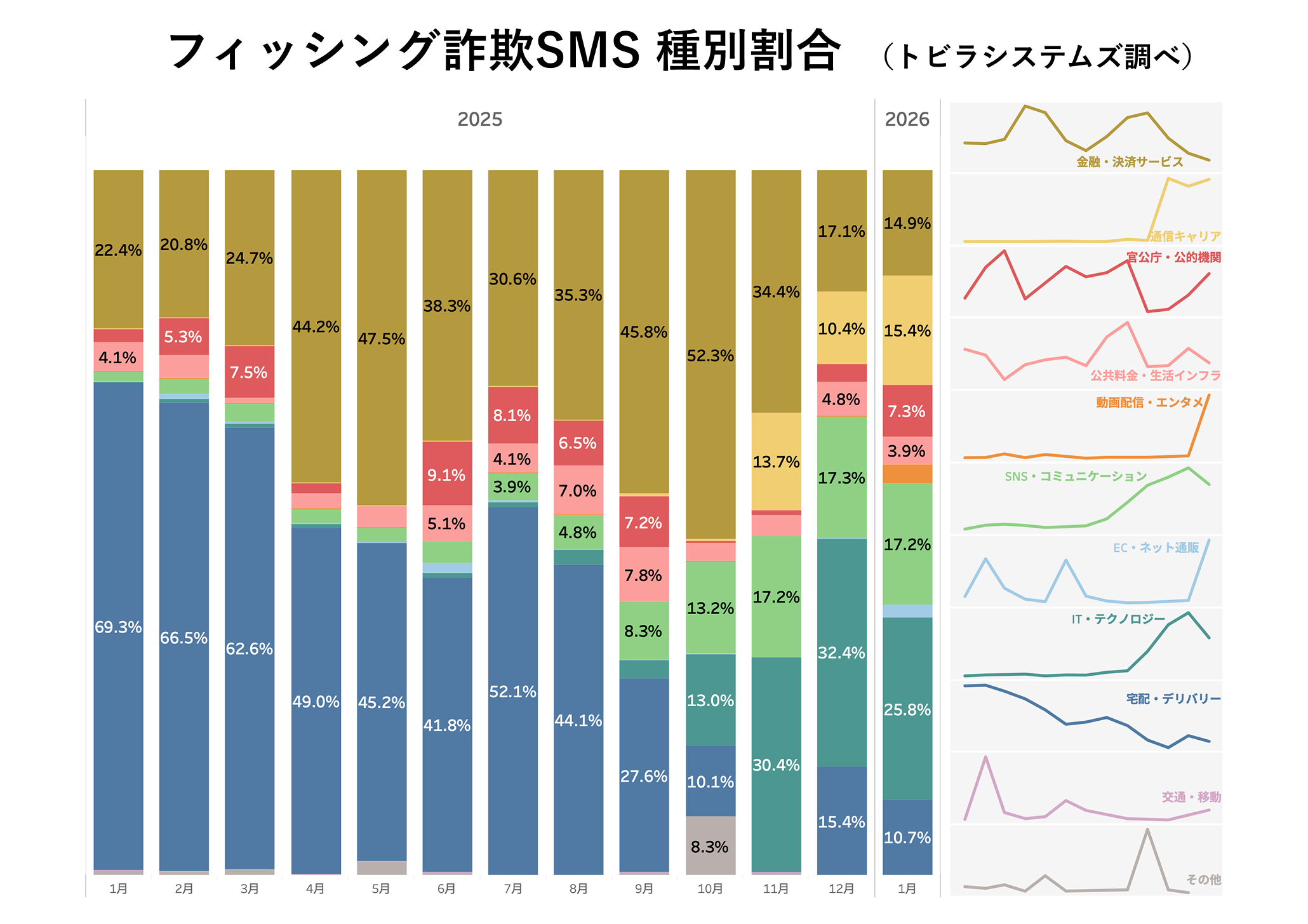 特殊詐欺やフィッシング詐欺の対策サービスを提供するトビラシステムズ株式会社(本社:愛知県名古屋市、代表取締役社長:明田 篤、証券コード:4441、以下「トビラシステムズ」)は、2026年1月に当社調査で確認された詐欺電話や詐欺SMSに関する独自調査レポートを公開します。(調査期間:2026年1月1日~1月31日)