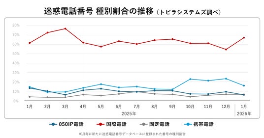 ○携帯電話番号を使った不審電話は減少、国際電話番号は再び増加2026年1月に新たにトビラシステムズの迷惑電話番号データベースに登録された番号の種別割合は、携帯電話番号が16.1%(前月比−7.4%)で前月より減少しました。一方で、国際電話番号は前月から増加し、67.2%(前月比+12.6%)となりました。