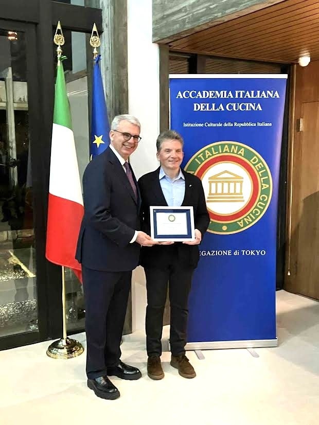 2026年1月22日受賞式在日イタリア大使 ジャンルイジ・ベネデッティ氏(左)ステファノ・ダル・モーロ 取締役 東京店 総料理長(右)