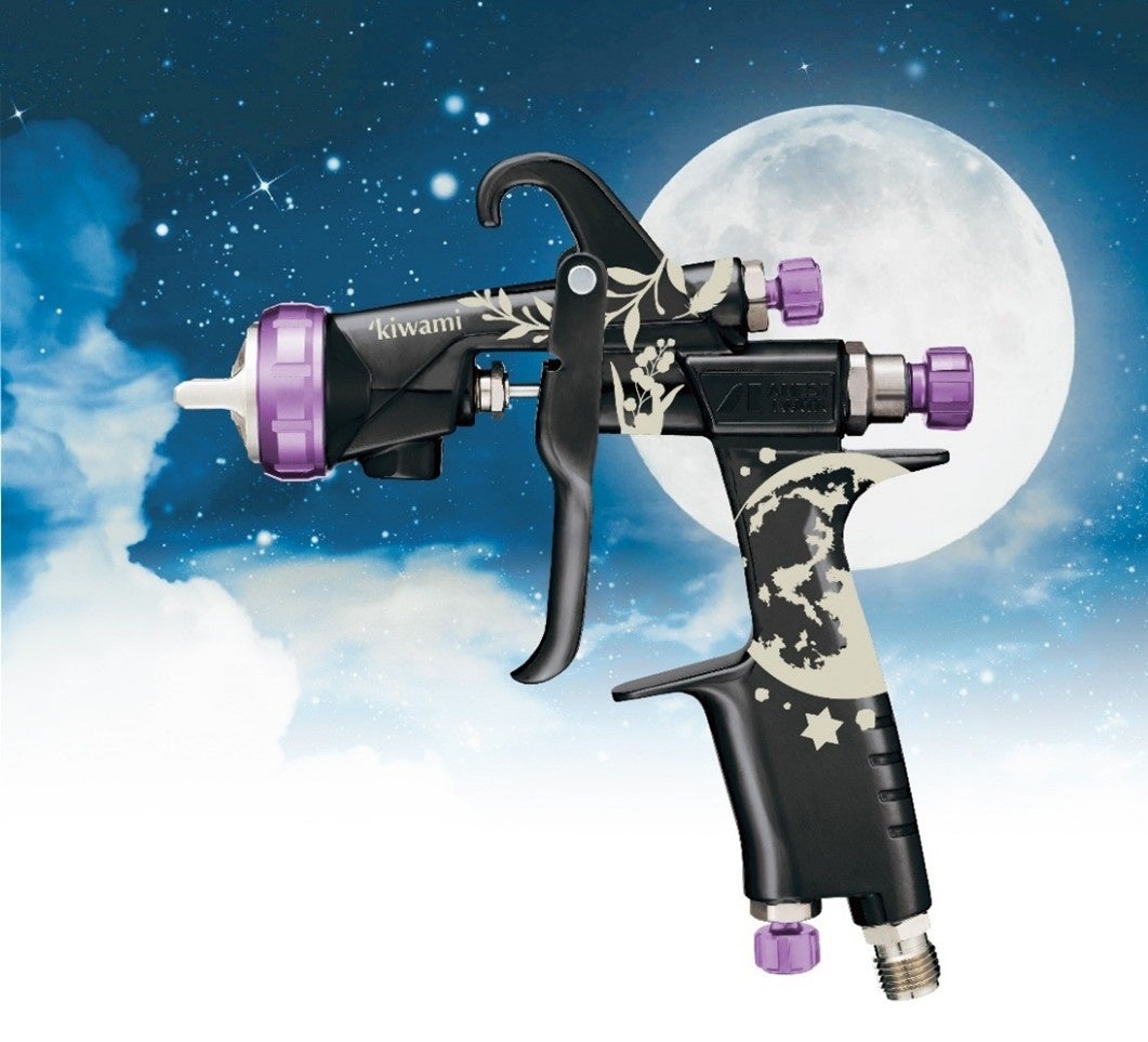 アネスト岩田の標準型スプレーガン【 KIWAMI-1-13B8・KIWAMI-1-14B8 】をベースに、国際女性デーを記念した特別仕様を施しています。性能面は標準品と同等のため、既存のユーザーの皆様も違和感なくご使用いただけます。デザイン: 黒コバルトメッキ、国際女性デーの象徴である「ミモザ」と、