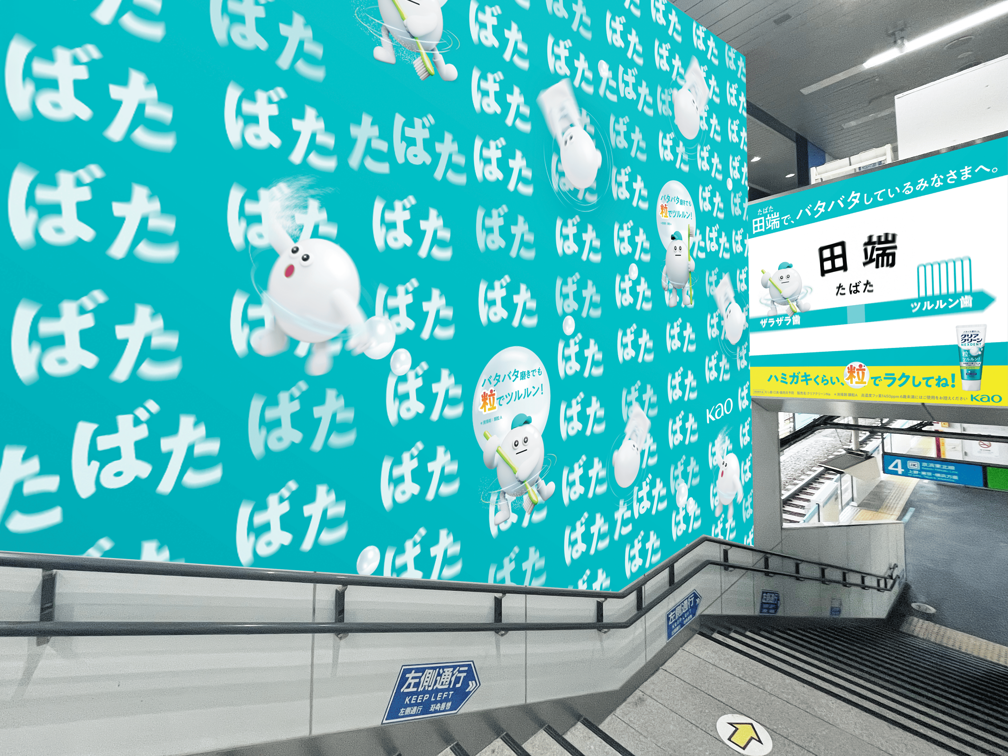 リニューアルを記念し、駅名に「バタ」が入るJR田端(タバタ)駅を期間限定で「バタバタ駅」として演出する特別施策を展開いたします。駅構内での交通広告掲出と駅周辺でのサンプリングキャンペーンを通じて、忙しい毎日を送る現代人に「バタバタ磨きでも粒*でツルルン」という新しい歯磨き習慣を提案いたします。