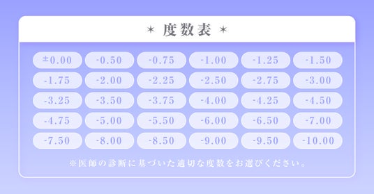 ±0.00(度なし)から-10.00まで、豊富な度数展開もご用意しておりますので、幅広い度数の方にお使いいただけます。
