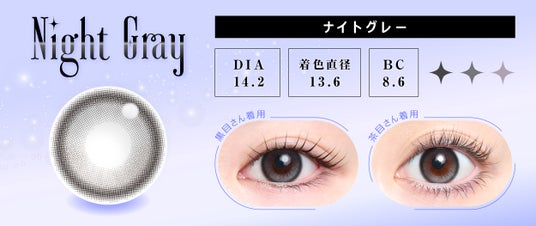 今回発売するのは「Night Black(ナイトブラック)」と「Night Gray(ナイトグレー)」の2色。いずれも回らない水光カラコンとなっているためハイライトが可愛く見える位置でキープされ、うるっとした瞳を演出します。また、着色直径13.6mmの使いやすいサイズで、水光レンズ初心者さんにもおすすめのデザインとなっております。