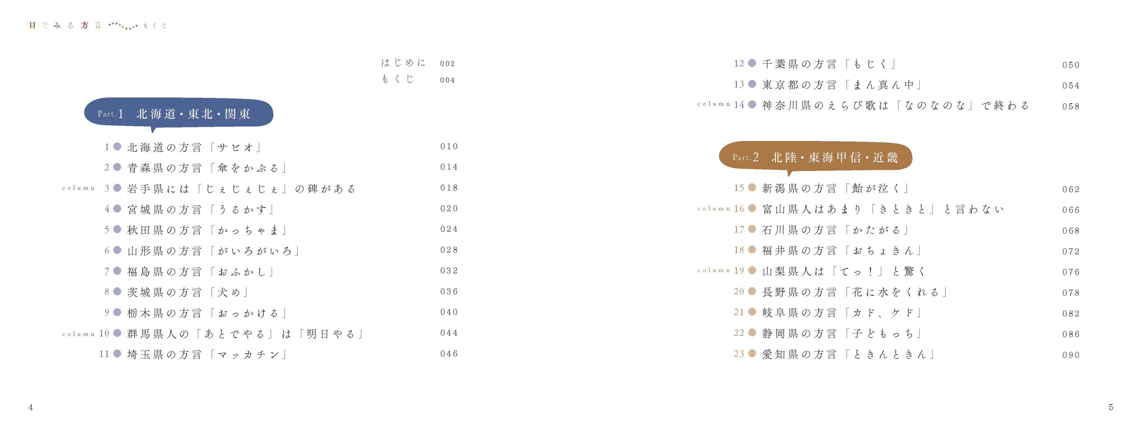 もうひとつは日本各地の方言を紹介すること。本書では、北は北海道から南は沖縄県まで、方言に関する全国47 都道府県の話題を取り上げて解説しています。北から南まで順番に配列していますが、順番通りに読む必要はありません。気になるところから読んでいただければと思います。