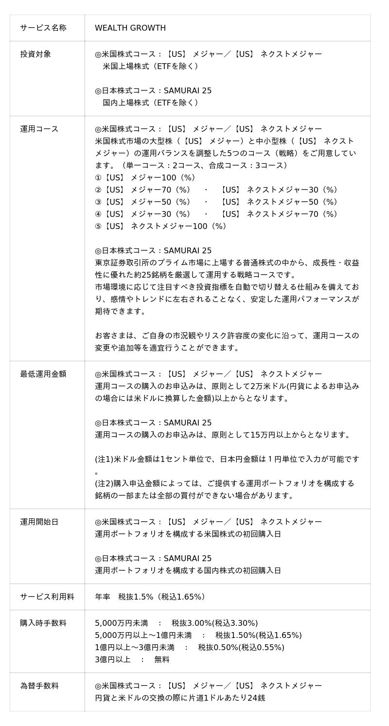 「WEALTH GROWTH」は、スマートプラスが提供する「Digital Wealth Manager (デジタルウェルスマネージャー、以下「DWM」という。)(*2)」を採用し、JTG証券とスマートプラスで共同開発した投資一任運用サービスです。富裕層の資産運用ニーズに応える、個人投資家向けとしては業界初の米国個別株のおまかせ運用サービスとして、2025年2月より提供を開始し、同年8月には、日本株式コースの提供も開始いたしました。提供するコースは、未来のマグニフィセント・セブン(*3)を発掘するというコンセプトのもと、ベンチマークとなるS&P500を上回るリターンを目指すアクティブ運用型の米国株式コース『【US】 メジャー/【US】 ネクストメジャー』(計5コース)と、ベンチマークとなるTOPIXを上回るリターンを目指すアクティブ運用型の日本株式コース『SAMURAI 25』をご提供しています。また、「WEALTH GROWTH」は、保有株式、売買履歴、配当など運用履歴が全てお客さま側で把握できる高い透明性を確保していることも特徴です。