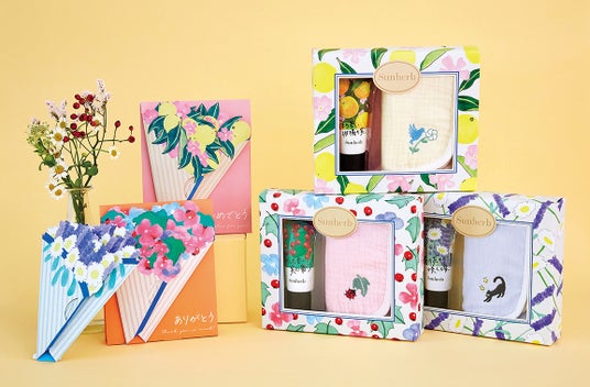 株式会社グローバルプロダクトプランニング(本社:東京都渋谷区南平台町)は、散歩中に出会う草花や果実の風景を閉じこめた『サンハーブ 陽だまりギフト』から、さまざまなシーンで贈りやすい花束のようなパッケージに入った「バスパウダーセット」と、ふんわりやわらかいマシュマロハンカチとくつろぎハンドクリームがセットになった「ハンカチ&ハンドクリームセット」を2月24日に発売します。
