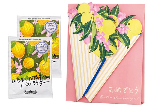 まるで花束のようなパッケージでバスパウダー2包を包んだメッセージプチギフト。