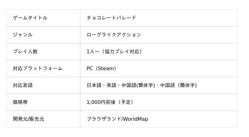 インディーゲームのパブリッシングを手掛けるWorldMap(運営:株式会社トライシステム)は、個人開発者 ブラウザランド が開発するローグライクアクション『チョコレートパレード』のSteamストアページおよび最新トレーラーを公開したことをお知らせいたします。