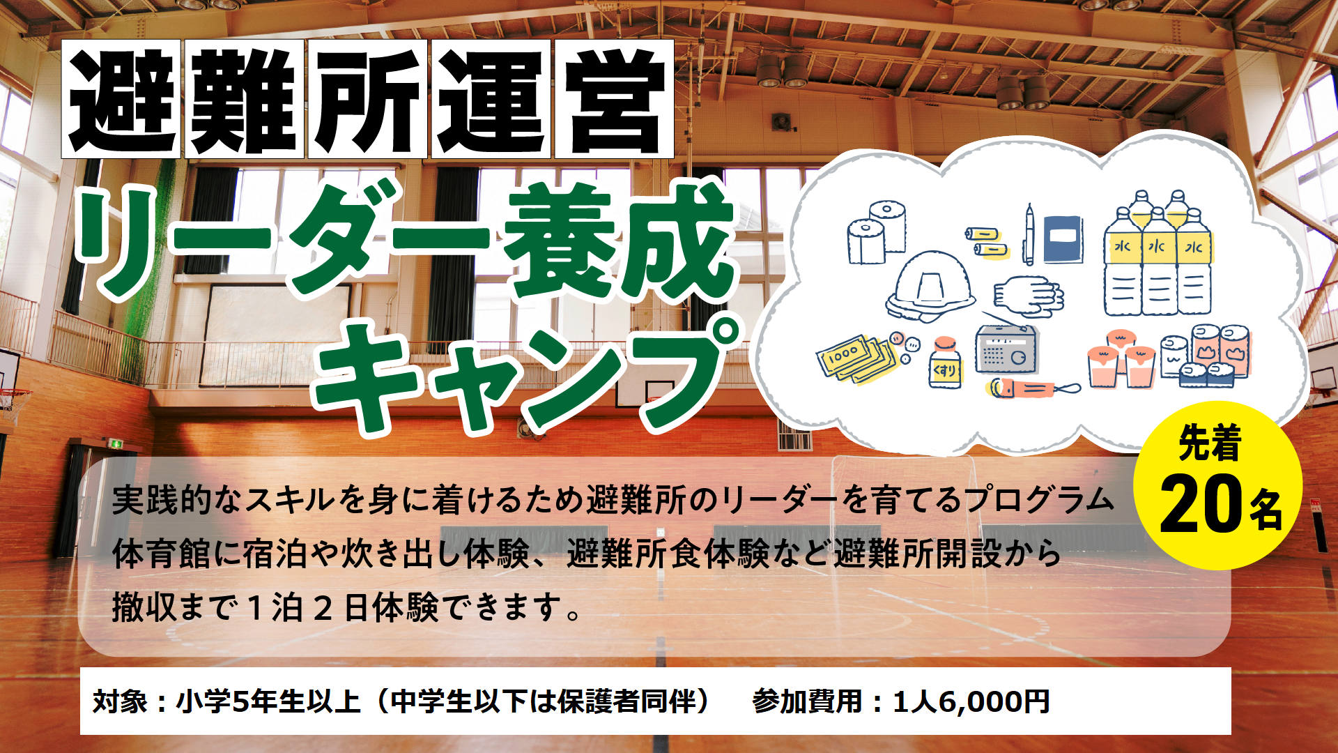 5.プロの練習拠点で学ぶ「避難所運営リーダー養成キャンプ」フェスティバルと同時開催で、1泊2日の「避難所運営リーダー養成キャンプ」を実施します。愛媛オレンジバイキングスの練習拠点(体育館)に宿泊し、角田寛和氏を全体統括指導者に迎え、避難所運営のノウハウやリーダーシップを学びます(※キャンプ参加者は別途募集中)。