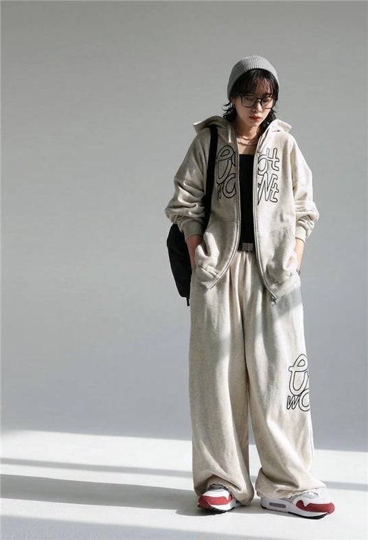 着るだけでスタイルが完成する、ダブルフェイスパーカーとロゴ刺繍スウェットパンツ。大胆なロゴデザインが主役。