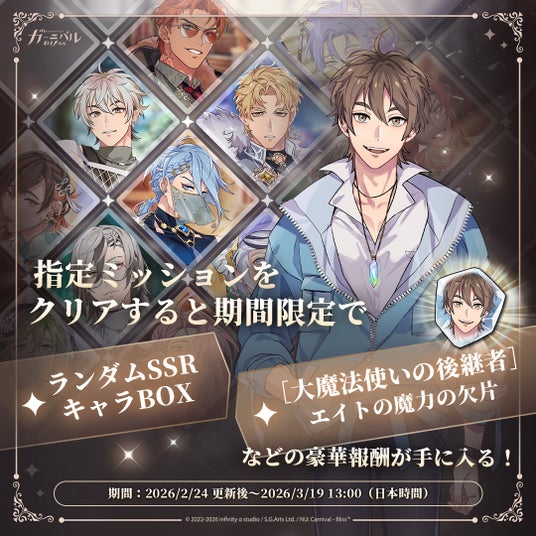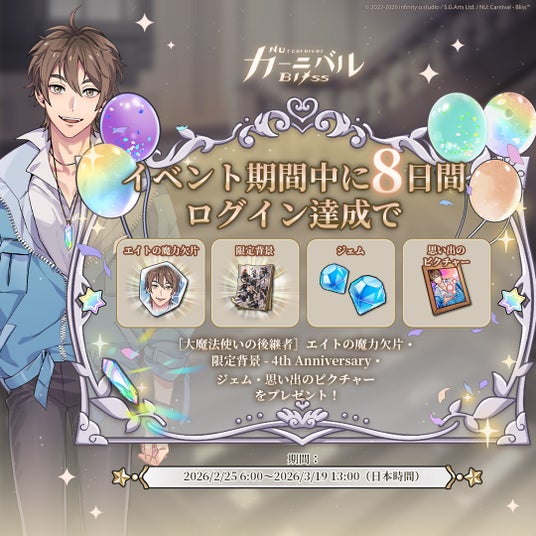 日本時間 2 月 25 日 6:00(日本時間) から 3 月 19 日 13:00(日本時間) まで、期間限定ログインボーナスがもらえます。[大魔法使いの後継者]エイトの欠片や、限定背景 - 4th Anniversary、ジェム、思い出のピクチャーなどをゲットしましょう!