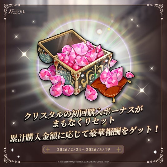 2026/2/24 更新後、【クリスタル初回チャージボーナス】を購入したことのあるプレイヤーは再度特典を獲得でき、【初回チャージプレゼント】と【期間限定TOP UPイベント】も同時に開催されます。
