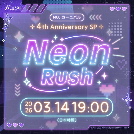 日本時間 3 月 14 日(土)19:00 (日本時間)より、4周年記念特別番組「NU: カーニバル 4th Anniversary SP -Neon Rush-」が「NU: カーニバル」公式YouTubeチャンネルにて配信されます!