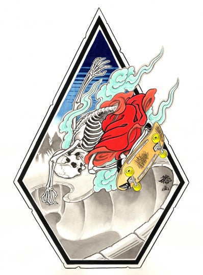 野坂稔和の表現の根底にあるのは、スケートで培われた自由な感性と、河鍋暁斎の精神や画法を基盤とした、日本文化への深い探究心。