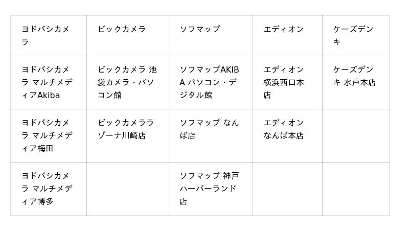 3月6日(金)発売日当日より、2-in-1ゲーミングノートPC「ROG Flow Z13-KJP」、ゲーミングヘッドセット「ROG Delta II-KJP」、ゲーミングマウス「ROG Keris II Origin-KJP」、ゲーミングマウスパッド「ROG Scabbard II XXL-KJP」を下記家電量販店にて展示予定です。詳しくは各家電量販店へお問い合わせください。