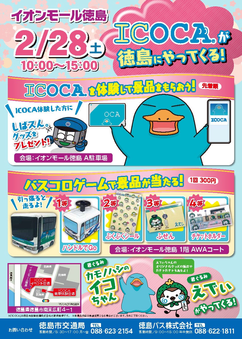 3月17日に導入する交通系ICカード「ICOCA」の乗車体験会を、徳島市交通局と徳島バス株式会社が共同で実施します。実際のバスを使った体験会で、どなたでもご参加できますので、イオンモール徳島にお越しの際はぜひお立ち寄りください。