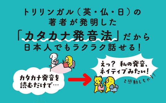 こうしたネイティブのクセを「9(+3)のルール」にまとめたものが、著者が発明した「カタカナ発音法」。例えば、玉ねぎは「アニュン」、旅行は「チュアーヴォ―」と、カタカナをそのまま読むだけで、どんな人でも一瞬でネイティブ並みの発音ができるようになる画期的なメソッドです。