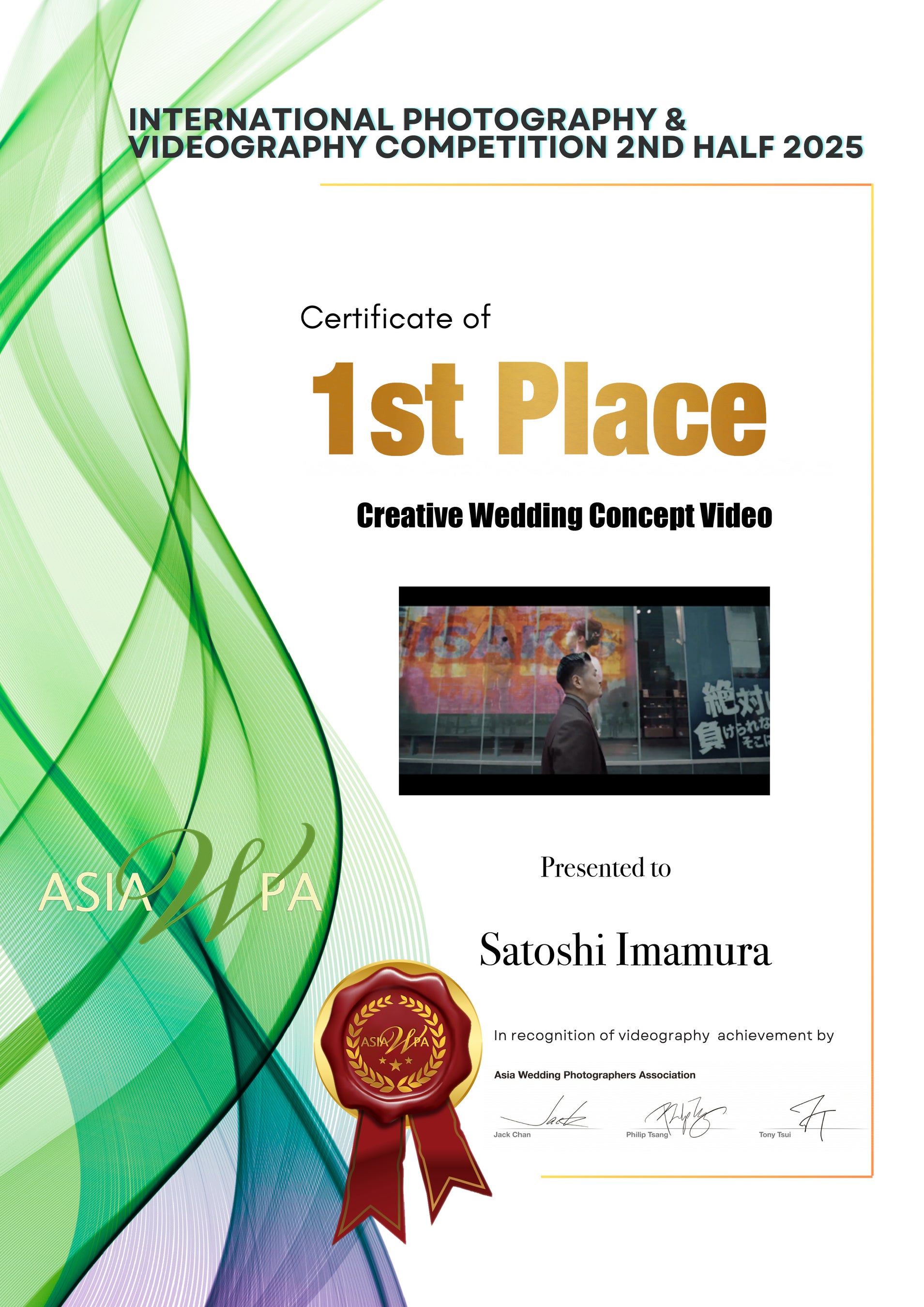 香港を拠点とする、アジア最大級のプロフォトグラファー組織「AsiaWPA(Asia Wedding Photographers Association)」が主催する国際コンペティションです。 アジアのみならず、世界各国のトップフォトグラファーやビデオグラファーが参加し、その技術と芸術性を競います。毎年2回(1st half / 2nd half)開催され、世界的に著名な写真家たちが審査員を務めることから、プロのキャリアにおける登竜門であり、最高峰の栄誉の一つとして知られています。