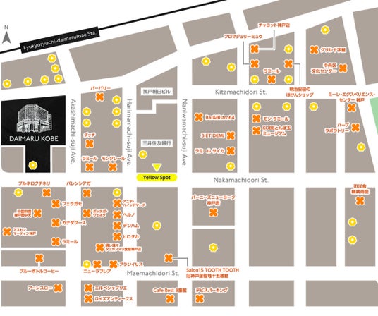 YELLOW SPOTと旧居留地RALLYの対象ショップのマップ