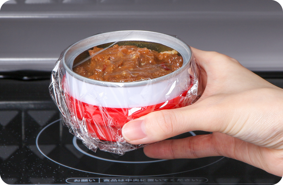 世界初、電子レンジで加熱ができる缶詰「レンジde缶(R)」従来の缶詰を温めて食べる場合、お皿など別の容器に移して電子レンジで温める方法が主流とされてきましたが、「レンジde缶(R)」は、缶のフタを外しラップをかけるだけで簡単に電子レンジで加熱することが可能です。