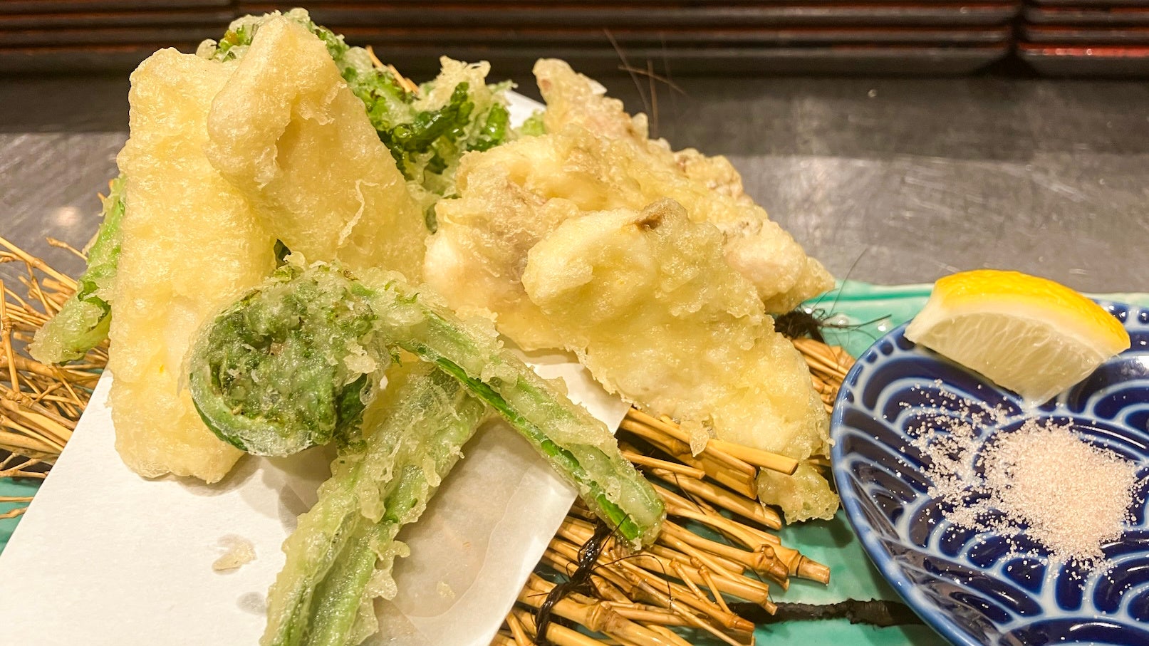 “春の皿には苦みを盛れ!”の言葉通り、ほろ苦い山菜(菜の花・こごみ・うど)を添えた天ぷら。