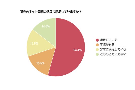 現在使用しているインターネットの速度に、「満足している」(54.4%)、「非常に満足している」(15.5%)と回答した人を合わせると、69.9%の結果となりました。「不満がある」(15.5%)、「どちらともいえない」(14.6%)と回答した人も一定数いるものの、比較的満足度は高い傾向がみられます。