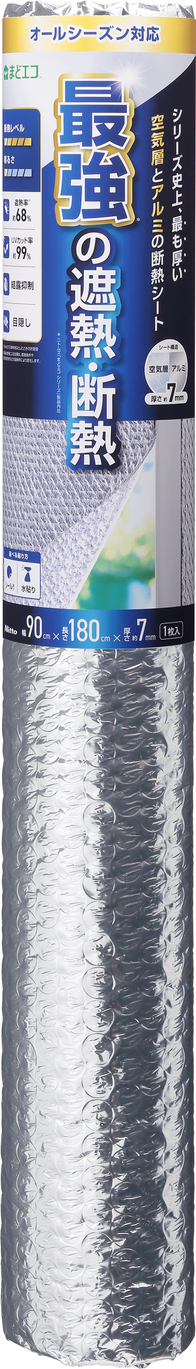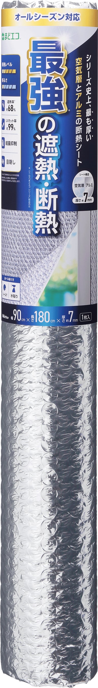 この度発売する「夏冬兼用 結露防止断熱アルミシート」は、当社が展開するシリーズ史上最も厚い約7 mmの空気層による断熱効果だけでなく、アルミシート層の反射による遮熱、日差し抑制効果も発揮するオールシーズン対応の断熱シートです。