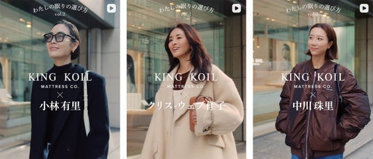 ドリームベッド株式会社(本社:広島市西区、代表取締役社長:三宅弘人)が展開する、米国発のプレミアムマットレスブランド「KING KOIL(キングコイル)」は、モデル・コラムニストのクリス-ウェブ佳子さん、ジュエリーデザイナーの小林有里さん、ベビーブランド「swell cove」ディレクターの中川珠里さんの3名をブランドアンバサダーに迎えました。
