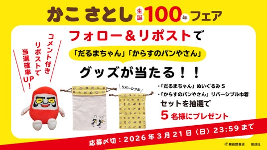 かこさとしさんの作品を出版する福音館書店と共同で「だるまちゃん」&「からすのパンやさん」の豪華プレゼントがあたるXキャンペーンを、3月中旬より開催いたします。