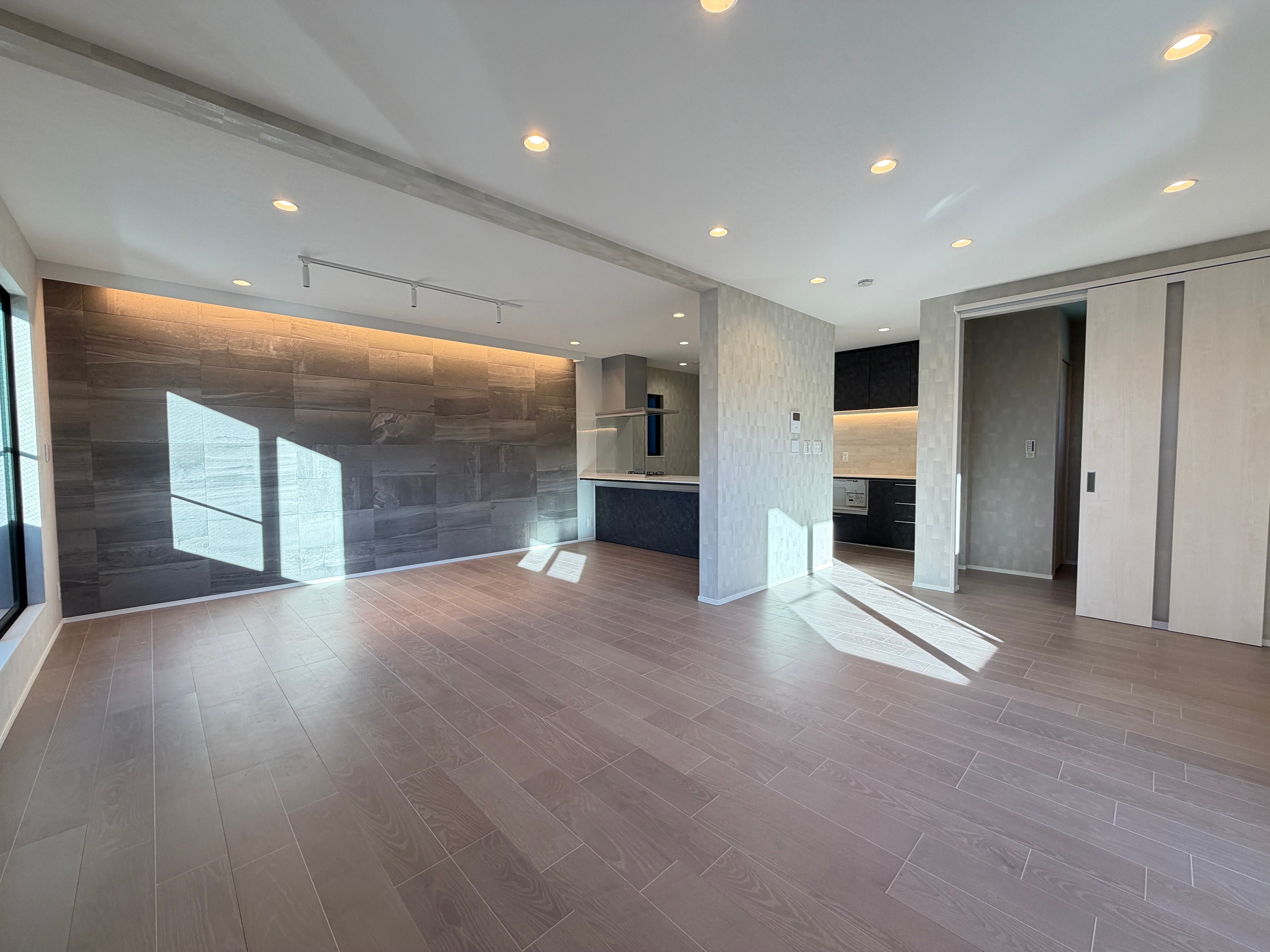 大きな窓から自然光が降り注ぎ、開放感にあふれる20帖超のリビング。家族が集う団らんの場としてはもちろん、ゲストを迎える空間としても十分なゆとりがあります。家具の配置自由度も高く、インテリアコーディネートを楽しめる贅沢な設計です。