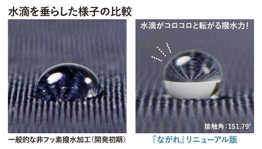 しかし、当社の開発した新しい非フッ素加工では、従来のフッ素加工とはまったく異なる新しい手法を採用しました。その結果、生地本来の柔らかい風合いを保ちながら、従来品に匹敵する高い撥水性能を実現することが可能となりました。